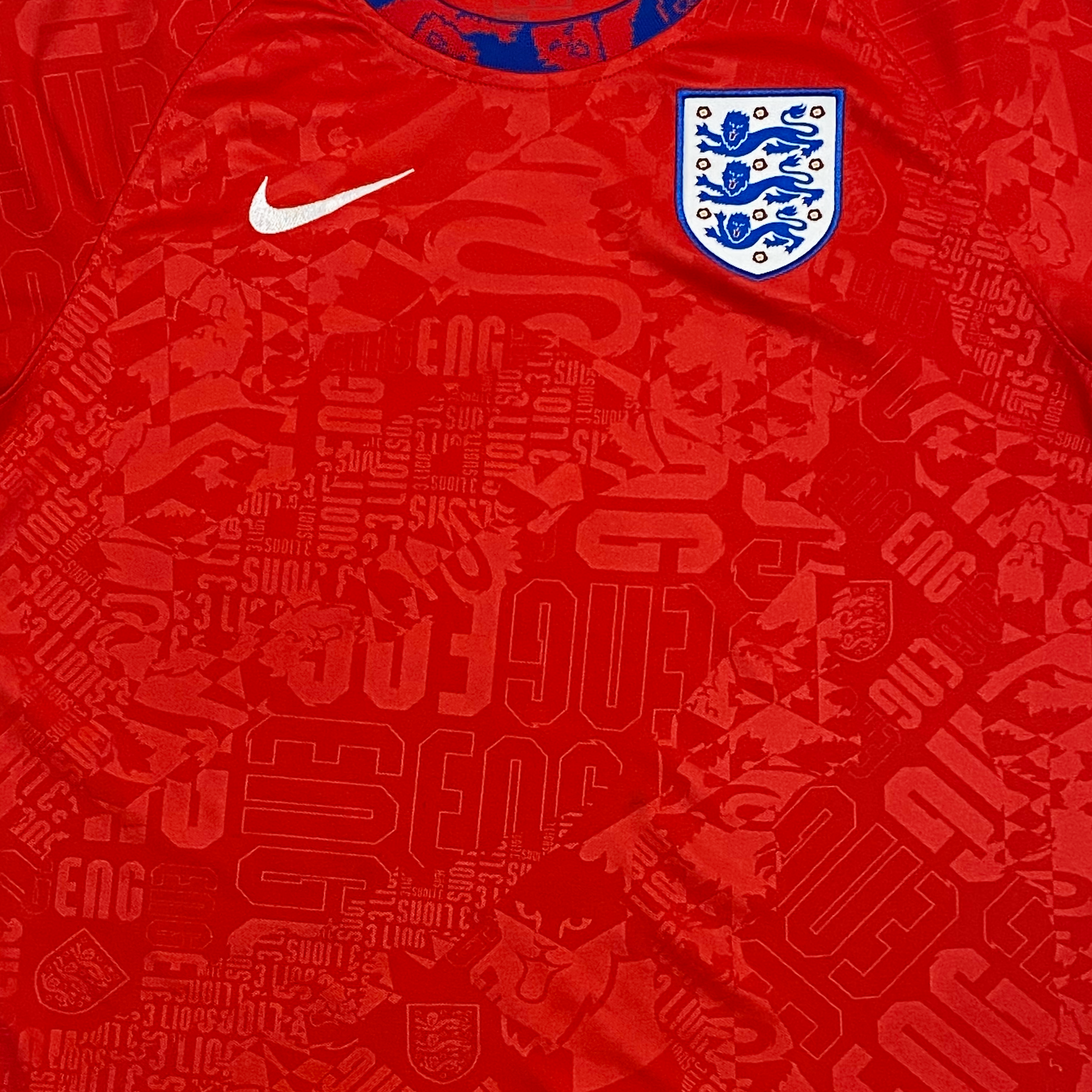 With a cool sublimated pattern throughout and a red body with blue collar, this England pre-match shirt is a great option for stylish young footballers.
